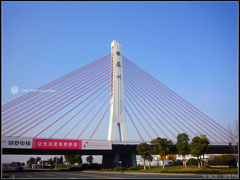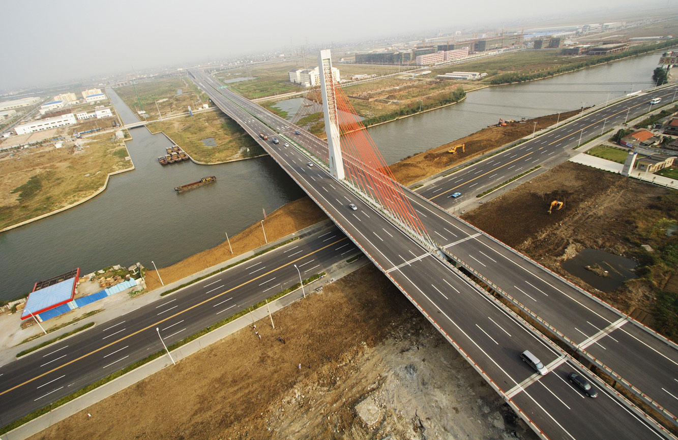 蘇州尹山大橋?yàn)樘K州繞城高速公路跨越京杭運(yùn)河(吳中區(qū))的大橋,全長545m。高速公路,雙向六車道。主橋?yàn)楠?dú)塔單索面預(yù)應(yīng)力混凝土斜拉橋,跨徑組合105m+70m,總長175m,橋梁全寬36.5m;引橋?yàn)?0m預(yù)應(yīng)力混凝土連續(xù)箱梁,總長370m,上下行分幅布置,橋梁全寬36.5m。