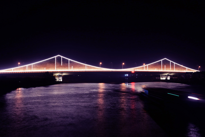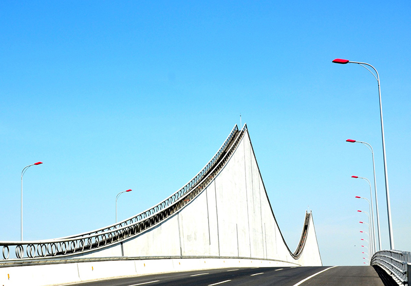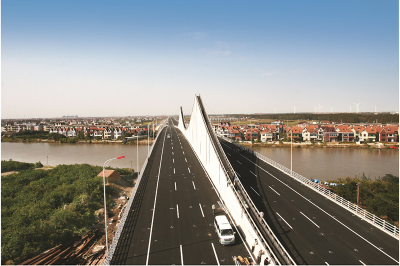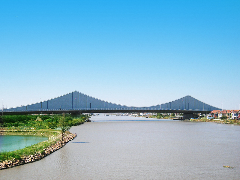 兩港公路(大治河-拱極路)大治河橋工程是上海市一條連接浦東機(jī)場和洋山深水港的快速連接通道,一級公路。主橋為國內(nèi)首座特大跨預(yù)應(yīng)力混凝土魚脊梁橋,跨徑組合92m+158m+92m,整幅橋?qū)?5m。跨度位居國際第二,橋面最寬。