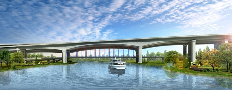 吳淞江大橋主線高架橋主橋采用大跨度預(yù)應(yīng)力混凝土連續(xù)箱梁,地面人非橋主橋采用懸掛型式,通過設(shè)置一定間距的吊桿將橋梁懸掛在主線高架橋下。該橋結(jié)構(gòu)型式新穎,在國內(nèi)尚屬首次。