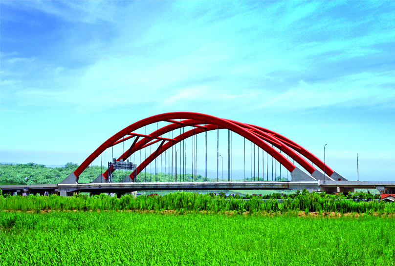 五尺溝大橋?yàn)闇J高速公路跨越五尺溝河道的大橋。主橋跨徑105m,橋?qū)?7.80m。橫斷面上三片系桿拱分別布置在中央分隔帶和橋邊兩側(cè),外部為簡(jiǎn)支體系。橋梁上部結(jié)構(gòu)由鋼管混凝土拱肋、預(yù)應(yīng)力混凝土系梁與橫梁、柔性吊桿及整體化橋面系組成。