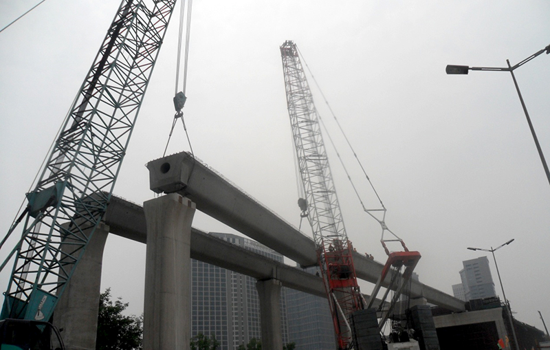 其中跨滬寧高速公路節(jié)點(diǎn)大橋是上海市跨徑最大的轉(zhuǎn)體施工連續(xù)梁橋,具有很大的設(shè)計(jì)、施工難度。該大橋采用三跨預(yù)應(yīng)力混凝土變截面連續(xù)箱梁,跨徑布置為75.5米+129米+75.5m,梁最高8米,寬10米,單段T構(gòu)轉(zhuǎn)體段長127米,單段轉(zhuǎn)體重5500噸,全橋轉(zhuǎn)體總重11000T。轉(zhuǎn)體采用目前國內(nèi)先進(jìn)的鋼球鉸平轉(zhuǎn)體系,與常規(guī)掛籃施工相比,此次大噸位橋梁轉(zhuǎn)體成功,不僅縮短了工程工期,而且減輕了高速公路上空橋梁掛籃施工各種安全風(fēng)險(xiǎn),并創(chuàng)下了國內(nèi)軌道交通轉(zhuǎn)體橋的長度和重量之最,為上海軌道交通11號(hào)線北段按時(shí)通車打下堅(jiān)實(shí)基礎(chǔ),也為我國大噸位轉(zhuǎn)體施工技術(shù)積累了寶貴經(jīng)驗(yàn)。對(duì)于提升上海、昆山兩地交通樞紐功能、加快昆山經(jīng)濟(jì)發(fā)展、建設(shè)花橋高端商務(wù)區(qū),具有十分重大的意義。