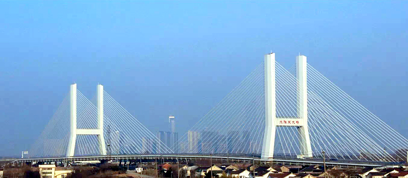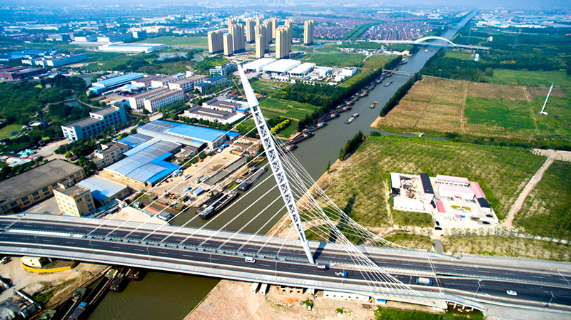 蘊藻浜大橋主橋采用跨徑為(35m+35m)+158m+40m的獨塔針形斜拉橋,塔梁鉸結、墩梁固結,橋面標準寬35.5m、梁高3m;主梁采用鋼—混凝土混合梁,主塔為彩針形,總高111m、斜拉索采用不對稱布置,主跨呈雙排單索面布置在中分帶內,邊跨為空間扭轉雙索面,布置在人行道外側。