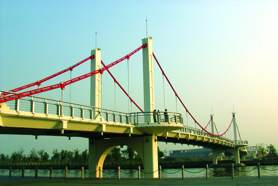 安亭汽車城汽車博覽公園吳淞江人行天橋,南接德國式安亭新鎮(zhèn)北連汽車博覽公園。是一座雙塔低高度鋼筋混凝土自錨式懸索橋。橋跨組合25m+70m+25m,橋?qū)?m,橋端設(shè)螺旋扶梯,橋塔處設(shè)觀景平臺。