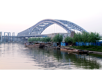 桃浦路蘊(yùn)藻浜大橋(現(xiàn)名昌吉東路大橋)全長772m。主橋采用兩跨連續(xù)的全焊接空間異型鋼桁-桁拱非對稱組合結(jié)構(gòu),這是一種能降低對道路平、縱曲線指標(biāo)影響、局部適應(yīng)道路平曲線形、具有較小結(jié)構(gòu)高度和較大跨越能力新型橋梁結(jié)構(gòu)。主橋跨徑為135m+66m,橋梁寬度33.5m。采用先梁后拱法施工。引橋采用現(xiàn)澆預(yù)應(yīng)力混凝土連續(xù)箱梁結(jié)構(gòu)。