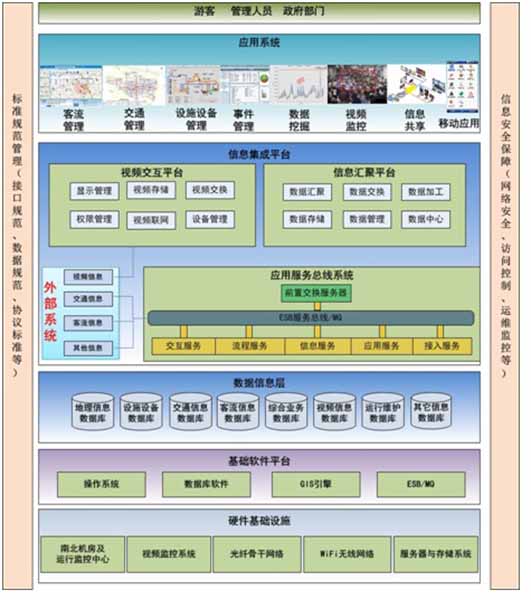 本項(xiàng)目主要建設(shè)范圍為上海國(guó)際旅游度假區(qū)核心區(qū)7km2范圍(除主題樂(lè)園用地部分的公共區(qū)域)的游客服務(wù)信息管理系統(tǒng)設(shè)計(jì),構(gòu)筑連接運(yùn)行監(jiān)控中心與各主要機(jī)房、相關(guān)設(shè)施的主干網(wǎng)絡(luò),為游客服務(wù)信息管理系統(tǒng)運(yùn)行提供基礎(chǔ)通信保障,實(shí)現(xiàn)各單體的互聯(lián)互通,實(shí)現(xiàn)本系統(tǒng)與其他系統(tǒng)的視頻、運(yùn)行數(shù)據(jù)等信息交換與共享;設(shè)計(jì)了運(yùn)行監(jiān)控中心及南北通信機(jī)房,設(shè)計(jì)了信息集成平臺(tái),實(shí)現(xiàn)核心區(qū)域內(nèi)主題樂(lè)園、湖泊邊緣、停車場(chǎng)、軌道交通等各單位的視頻、客流、交通等各類信息的匯聚、抽取、組織與共享管理;圍繞游客服務(wù)與管理需求,設(shè)計(jì)了客流管理、交通管理、設(shè)施設(shè)備運(yùn)行監(jiān)控、移動(dòng)應(yīng)用、數(shù)據(jù)挖掘、信息共享管理等應(yīng)用系統(tǒng)。