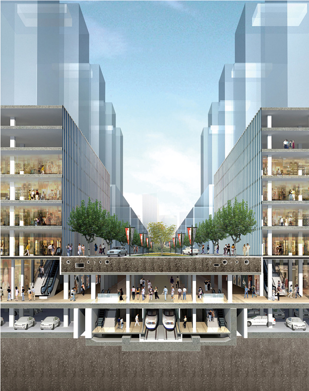 本項目規(guī)劃地下建筑面積400萬m2,項目的人行車行系統(tǒng)規(guī)劃體現(xiàn)了網(wǎng)絡化與節(jié)點分級概念;采用共同溝管道化運營,減少系統(tǒng)之間的干擾,提高各系統(tǒng)之間運營效率;規(guī)劃可分可合,有利工程實施,減少實施難度。