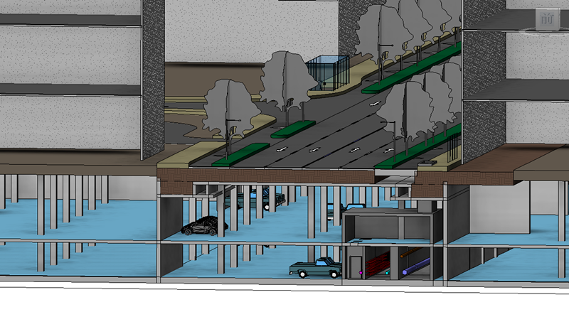 項目進行了綜合管廊與地下空間的合建、點—線—面結(jié)合的地下空間總體布局,采用了 靈活可行的綜合管廊與地下空間分期開發(fā)策略,并結(jié)合了BIM進行設(shè)計。
