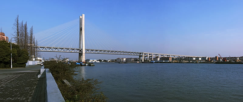 上海閔浦二橋是一座公軌兩用一體化雙層跨黃浦江特大橋,全長4.893km,上層為二級公路,雙向4車道,下層為雙線輕軌。主橋為獨塔雙索面連續(xù)鋼板桁組合斜拉橋,主橋總長436.65m,是目前國內(nèi)跨度最大的公軌兩用雙層鋼桁架獨塔斜拉橋斜拉橋,也是世界同類型雙層橋梁中跨度最大的??辈焱瓿煽傔M尺約6834米。