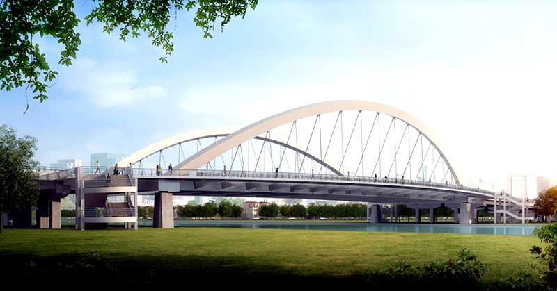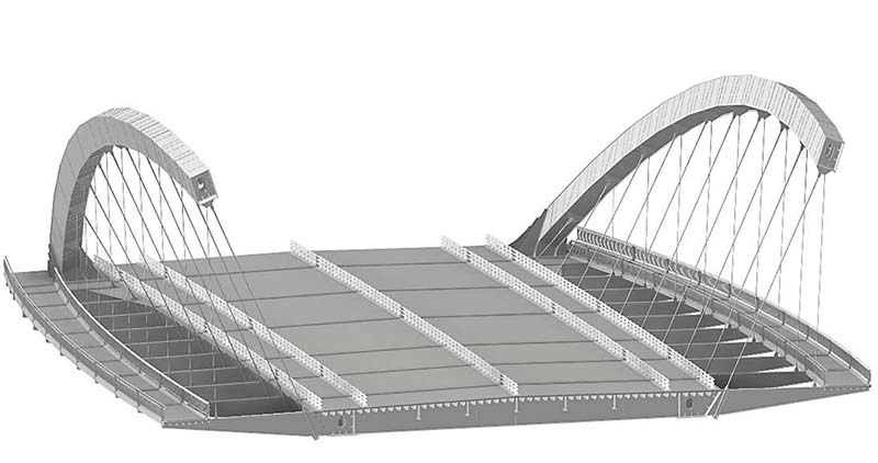 金匯港大橋是奉浦大道道路工程中的重要組成部分,全場432米。主橋為16m+100m+16m外傾拱肋下承式系桿拱,全鋼結(jié)構(gòu);引橋為東西兩側(cè)各5X30m共10孔組合小箱梁,結(jié)構(gòu)體系復(fù)雜。本項目的BIM應(yīng)用開展對BIM應(yīng)用于橋梁鋼結(jié)構(gòu)工程的實踐與探索,力求建立完整表達(dá)設(shè)計意圖、真實反映施工過程、有序管理施工進(jìn)度的信息共享的平臺,提升項目管理的技術(shù)水平,也為今后類似工程剪力較為完整的操作程序,推動BIM技術(shù)的發(fā)展與深化。