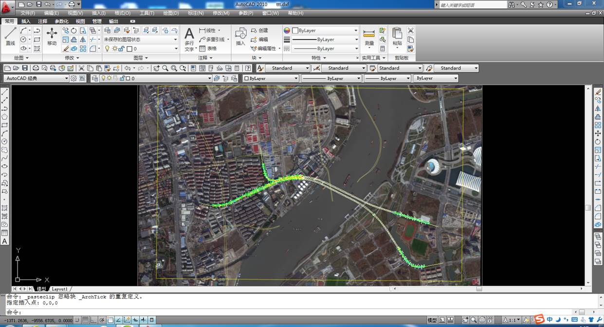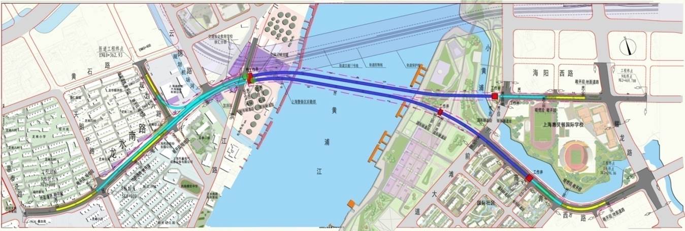 龍水南路越江隧道連接浦東前灘與徐匯濱江,采用雙向4車道規(guī)模,南北雙線長(zhǎng)約2km。浦西隧道主線出入口在龍水南路上采用錯(cuò)位布置的形式,并設(shè)置規(guī)劃六路出口匝道;浦東隧道主線出入口分別設(shè)置在高青西路和海陽(yáng)西路上。越江段采用外徑11.36m的雙管單層盾構(gòu)。項(xiàng)目處于工可設(shè)計(jì)階段。借助BIM技術(shù)輔助設(shè)計(jì),應(yīng)用GoogleEarth地形準(zhǔn)確導(dǎo)入AutoCAD中。通過CAD的二次開發(fā),自動(dòng)獲得盾構(gòu)段管片錯(cuò)縫拼裝三維模型。