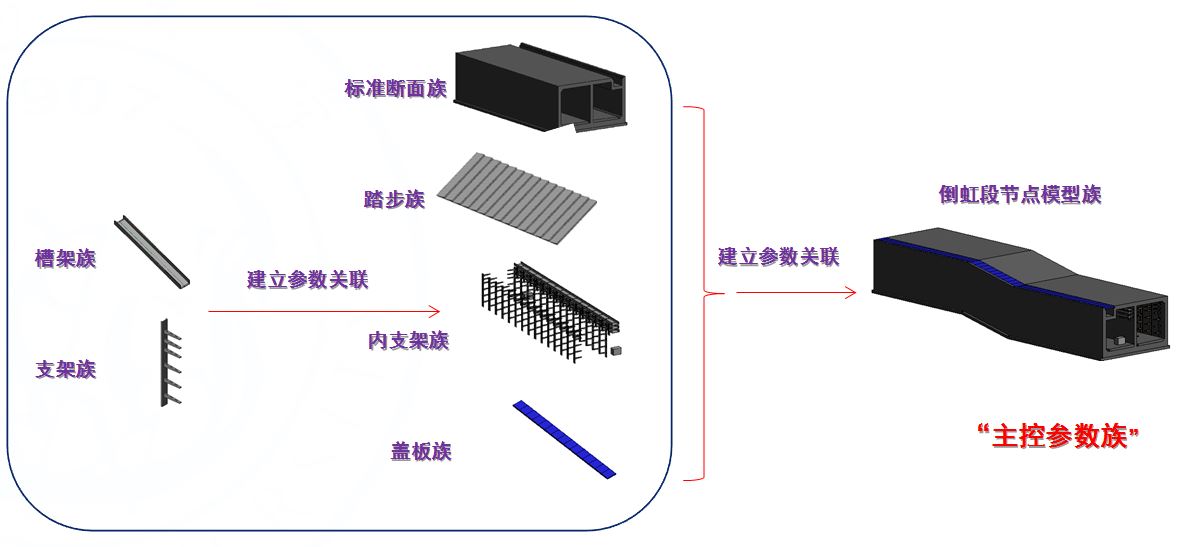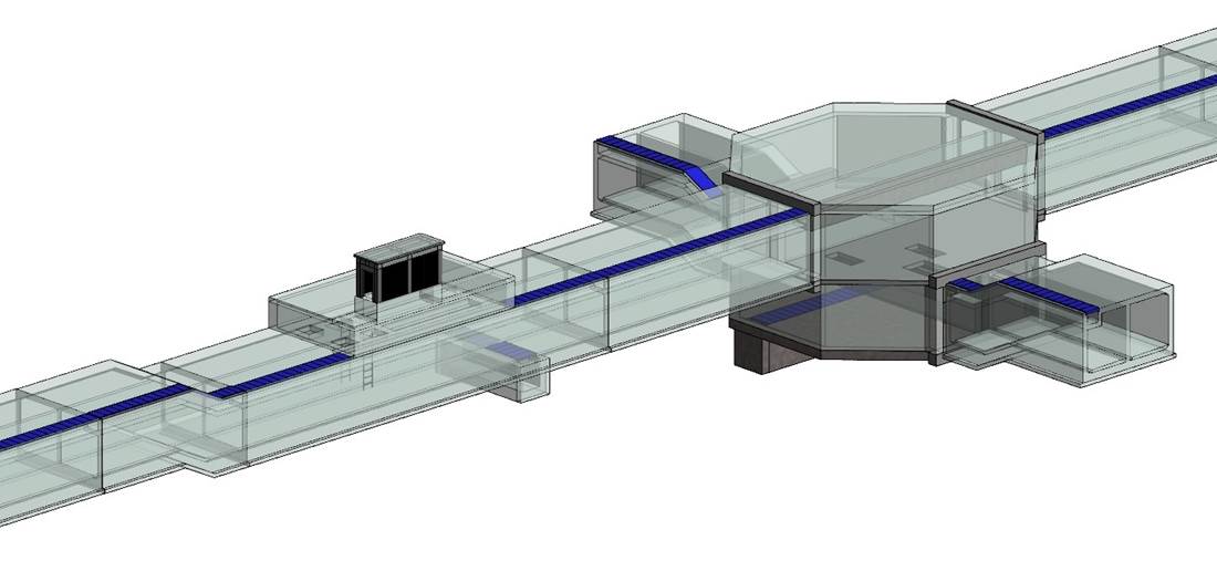 臨西十一路綜合管廊總長度11.6公里,采用雙倉斷面,標準段外包尺寸為3.7mx6.25m,管廊納入管線包括電力、通信、給水、燃氣。本項目利用參數(shù)化族實現(xiàn)管廊快速化建模,尤其在管廊設計日益標準化的背景下,參數(shù)化設計具有良好實用性;由于模型實現(xiàn)參數(shù)化,提高了模型的準確性和可控性;BIM建模過程中發(fā)現(xiàn)綜合管廊開洞位置,管線布置存在碰撞、沖突的地方,隨時調(diào)整相關參數(shù)即可完成單個和批量修改;通過BIM模型建立,檢查整體方案的可行性,精確統(tǒng)計工程量等。
