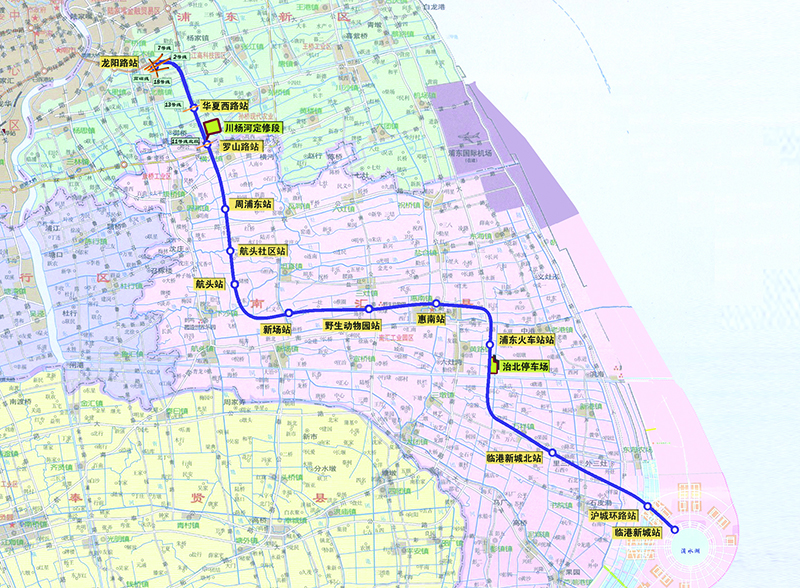 軌道交通16號(hào)線起自龍陽(yáng)路站,終至滴水湖站;全長(zhǎng)58.962km,高架線45.221km,地下線13.741km;設(shè)高架站10座,地下站3座;設(shè)川楊河定修段(與11號(hào)線、13號(hào)線共址)及治北停車(chē)場(chǎng)、3座主變電站(分別位于羅山路、惠南、臨港北)、1座控制中心(納入隆德路控制中心與11號(hào)線、13號(hào)線共址統(tǒng)一調(diào)度管理)。