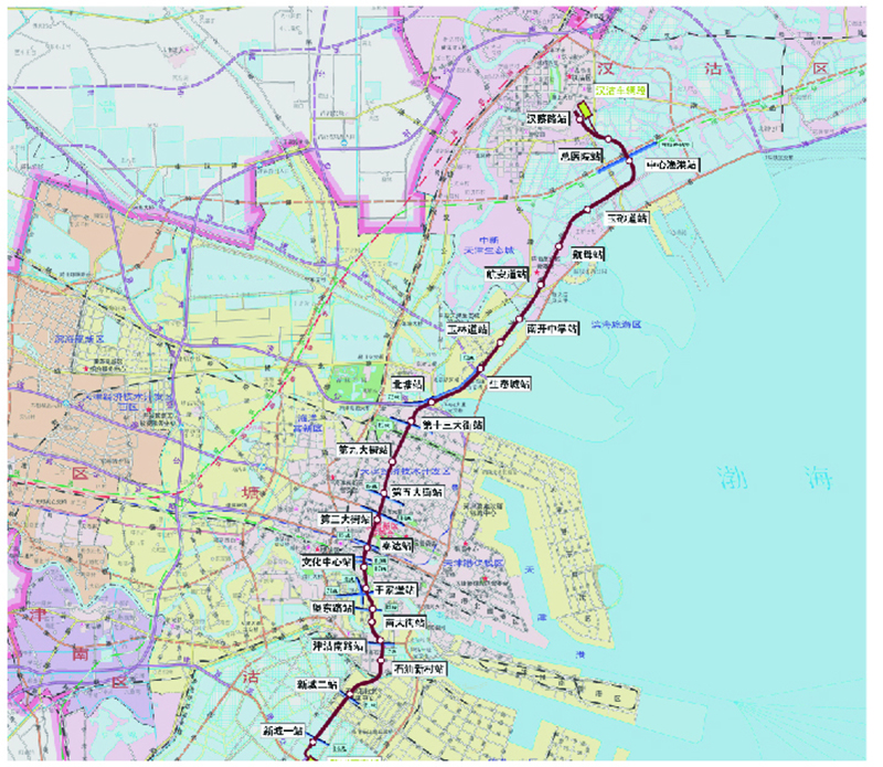 本工程起自中部新城,經(jīng)于家堡、天堿、開發(fā)區(qū)、北塘、中新生態(tài)城、濱海旅游區(qū)至漢沽。全線長(zhǎng)約43.602km,其中高架線28.309km,地下線15.293km。設(shè)車站23座,高架站13座,地下站10座。最大站間距4.646km,最小站間距0.631km,平均站間距1.9km。其中12座車站分別與軌道交通線網(wǎng)中10條軌道交通線路及京津城際鐵路、規(guī)劃環(huán)渤海城際鐵路換乘。全線設(shè)車輛段、停車場(chǎng)各1處,運(yùn)營(yíng)中心1座,主變電所2座。