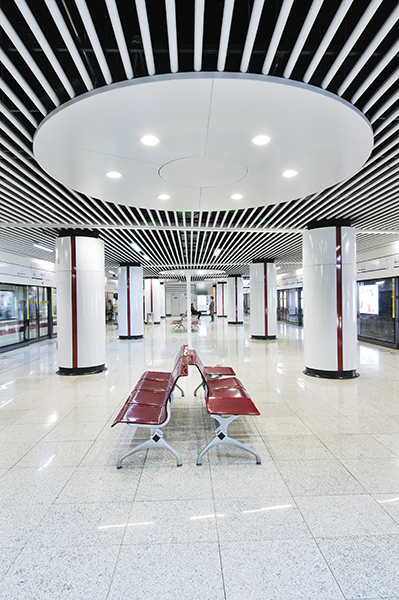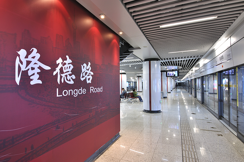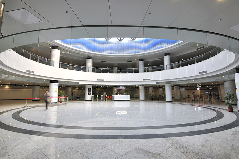 軌道交通11號(hào)線隆德路站位于普陀區(qū)曹楊路、隆德路交叉口的東側(cè)地塊內(nèi),與沿隆德路走向的規(guī)劃13號(hào)線形成“十”字換乘,11號(hào)線為地下三層站,13號(hào)線為地下四層站。在兩線交匯區(qū)域設(shè)橢圓形中庭共享空間,通過(guò)頂板的采光穹頂將自然環(huán)境光引入地下車(chē)站。