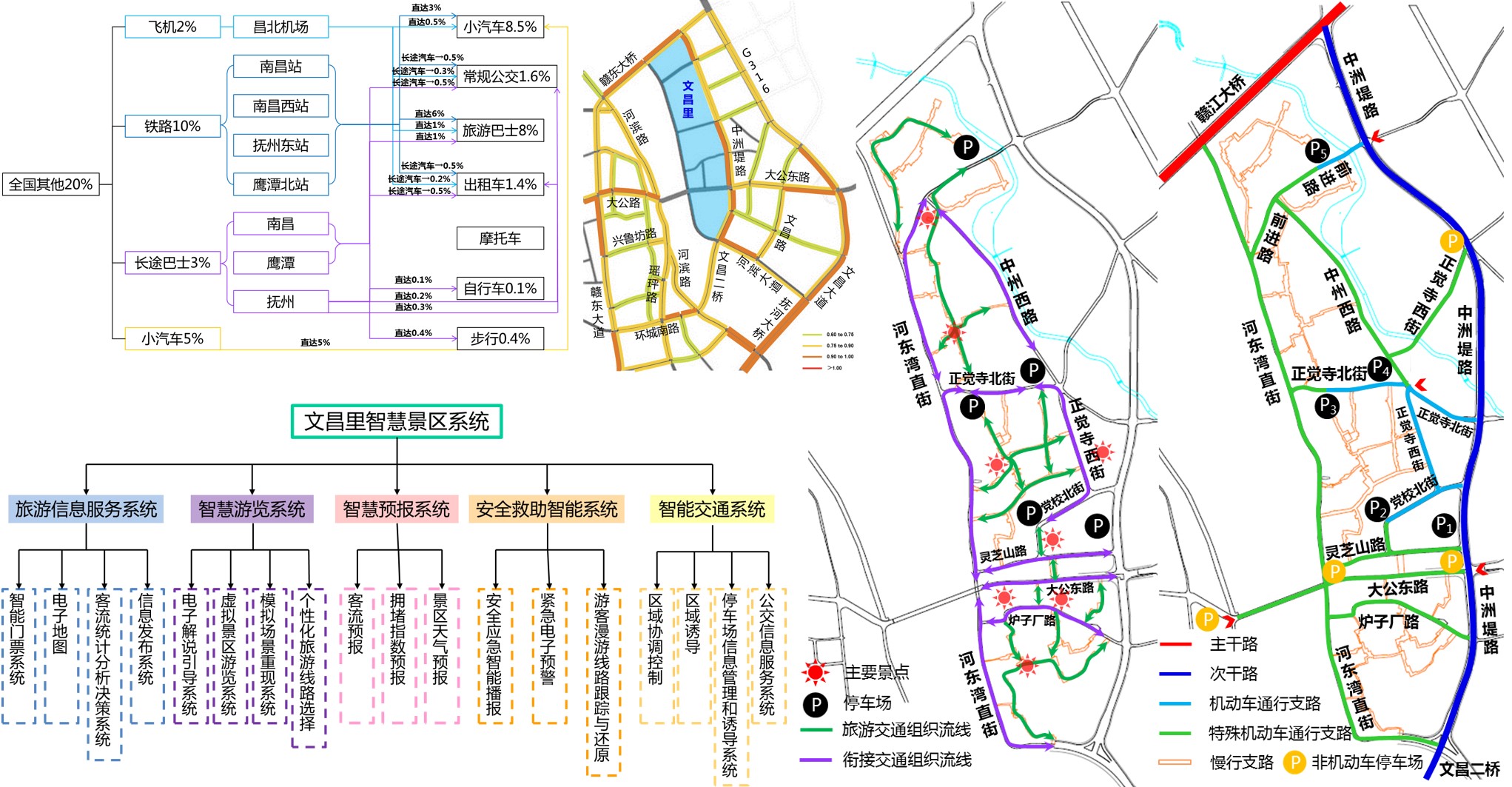 規(guī)劃方案從旅游交通組織入手,在道路系統(tǒng)規(guī)劃中引入了街道類型劃分概念,明確道路建設指引,保證與歷史街區(qū)的和諧統(tǒng)一;在慢行系統(tǒng)規(guī)劃中,提出“2島、3軸、4區(qū)”的慢行系統(tǒng)空間結構,落實“人文、生態(tài)、活力、智慧”4大規(guī)劃理念,并對文昌里的慢行系統(tǒng)服務水平進行了定量評價;在智能交通系統(tǒng)規(guī)劃中,引入了區(qū)域協(xié)調控制、區(qū)域誘導、停車場信息管理系統(tǒng)等,制定了大客流應急預案,提出“互聯(lián)網(wǎng)+智慧景區(qū)”、“線上遠程網(wǎng)絡虛擬現(xiàn)實(VR)三維景點”、“線下增強現(xiàn)實(AR)、歷史場景數(shù)字再現(xiàn)”等旅游新概念的設想。