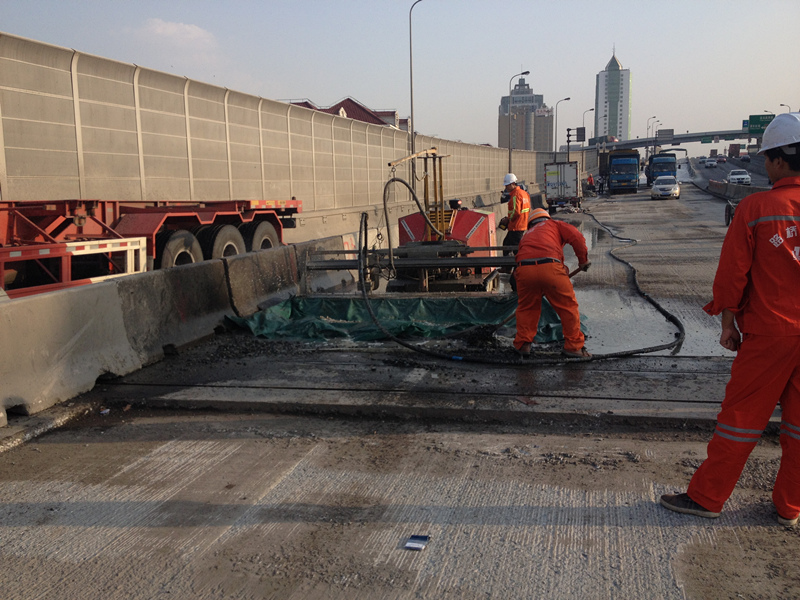 為加快施工進(jìn)度、減小對(duì)社會(huì)交通的影響,維修關(guān)鍵工序-混凝土鋪裝的破除,采用“高壓水射流”技術(shù),俗稱“水刀”,同時(shí)結(jié)合交通組織,對(duì)部分橋面混凝土鋪裝采用快速混凝土以縮短施工周期,實(shí)現(xiàn)了維修工程“快速、集中、文明”施工。