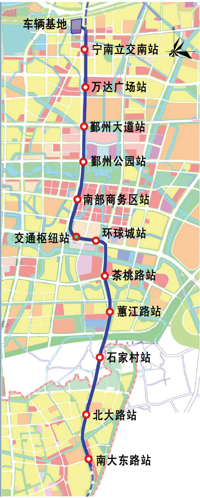 寧波市鄞州區(qū)現(xiàn)代有軌電車實(shí)驗(yàn)線一期工程線路全長(zhǎng)8.16km,聯(lián)系鐘公廟、首南、姜山,覆蓋西側(cè)客流走廊,一期線路長(zhǎng)約8.1公里,設(shè)站12座,地面敷設(shè),預(yù)留向北延伸條件,平均站間距723m,最大站間距1018m,最小站間距469m,全線設(shè)置12座車站、一座車輛基地和一個(gè)控制中心。