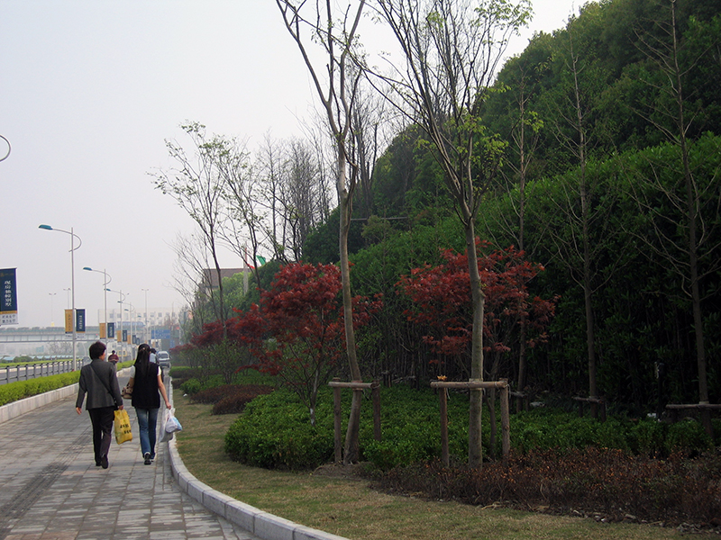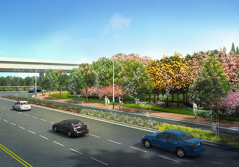 本項(xiàng)目包含長(zhǎng)約23公里的中環(huán)線(浦西段)萬(wàn)榮路以西-上中路隧道綠化工程,和長(zhǎng)約9.5公里的(浦東段)市政附屬綠化及兩側(cè)綠帶。地面道路綠化布置充分考慮車(chē)輛在行駛中產(chǎn)生的景觀方向性,以斜向種植的手法,增加道路觀賞面景觀的豐富性。高架橋蔭下摒棄常用的綠籬形式,選擇耐蔭植物以自然團(tuán)狀的形式,達(dá)到植物品種的多樣性。沿線行道樹(shù)的選擇則在詳細(xì)分析道路走向和兩側(cè)建筑的環(huán)境狀況后,分段選擇適合各區(qū)立地條件的植物品種。
