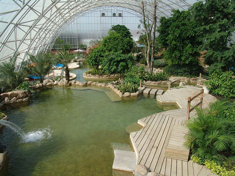 本項目的建設以展示社會主義新農村建設、城市農家樂為特色,突出高新科技在新農村建設應用與體驗。建成后的浦江源溫泉農莊將成為新型休閑旅游開發(fā)項目的示范窗口。溫泉農莊以挖湖堆山的造園手法在溫室大棚中模擬熱帶雨林自然環(huán)境,利用地形的變化,結合植物以及瀑布、音響等效果,使置身于內的人們深刻感受到熱帶雨林的氣息。示范區(qū)內的水源來自基地內的溫泉泉水。