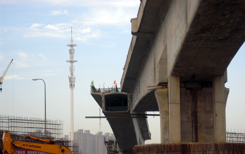 其中跨滬寧高速公路節(jié)點(diǎn)大橋是上海市跨徑最大的轉(zhuǎn)體施工連續(xù)梁橋,具有很大的設(shè)計(jì)、施工難度。該大橋采用三跨預(yù)應(yīng)力混凝土變截面連續(xù)箱梁,跨徑布置為75.5米+129米+75.5m,梁最高8米,寬10米,單段T構(gòu)轉(zhuǎn)體段長127米,單段轉(zhuǎn)體重5500噸,全橋轉(zhuǎn)體總重11000T。轉(zhuǎn)體采用目前國內(nèi)先進(jìn)的鋼球鉸平轉(zhuǎn)體系,與常規(guī)掛籃施工相比,此次大噸位橋梁轉(zhuǎn)體成功,不僅縮短了工程工期,而且減輕了高速公路上空橋梁掛籃施工各種安全風(fēng)險(xiǎn),并創(chuàng)下了國內(nèi)軌道交通轉(zhuǎn)體橋的長度和重量之最,為上海軌道交通11號(hào)線北段按時(shí)通車打下堅(jiān)實(shí)基礎(chǔ),也為我國大噸位轉(zhuǎn)體施工技術(shù)積累了寶貴經(jīng)驗(yàn)。對(duì)于提升上海、昆山兩地交通樞紐功能、加快昆山經(jīng)濟(jì)發(fā)展、建設(shè)花橋高端商務(wù)區(qū),具有十分重大的意義。